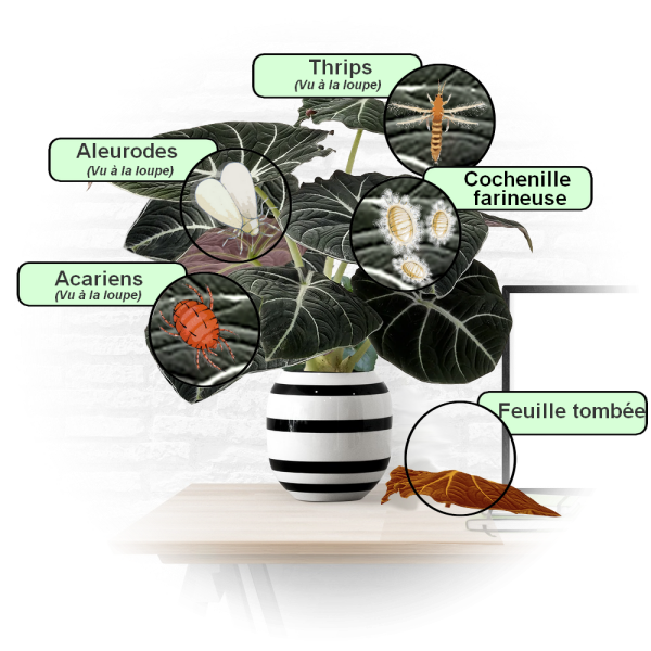 | Le Thrips : | Ces petits insectes noirs sautent et volent de plante en plante, suçant la sève et se manifestant sur feuilles de votre Alocasia "black velvet" par des rayures et des mouchetures argentées | .Comme pour l'aleurode |