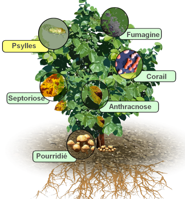 Sur les feuilles devenues collantes à regarder de près on aperçoit de petits insectes ressemblants à des pucerons ailés, les psylles. |