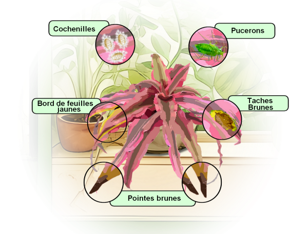 | Araignées rouges : | Les tétranyques, connus sous le nom d'araignées rouges, peuvent être un problème. Ils se nourrissent de la sève de la plante, ce qui peut entraîner un affaiblissement général et des feuilles recroquevillées. | Vaporisez donc de l’eau non calcaire régulièrement sur le feuillage pour humidfier pour offrir une ambiance humide autour de votre Cryptanthus bivittatus . |