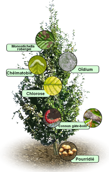 Ce sont surtout les jeunes charmes, charmilles qui ont le plus à souffrir des maladies et parasites. Des insectes xylophages attaquent les vieux sujets.