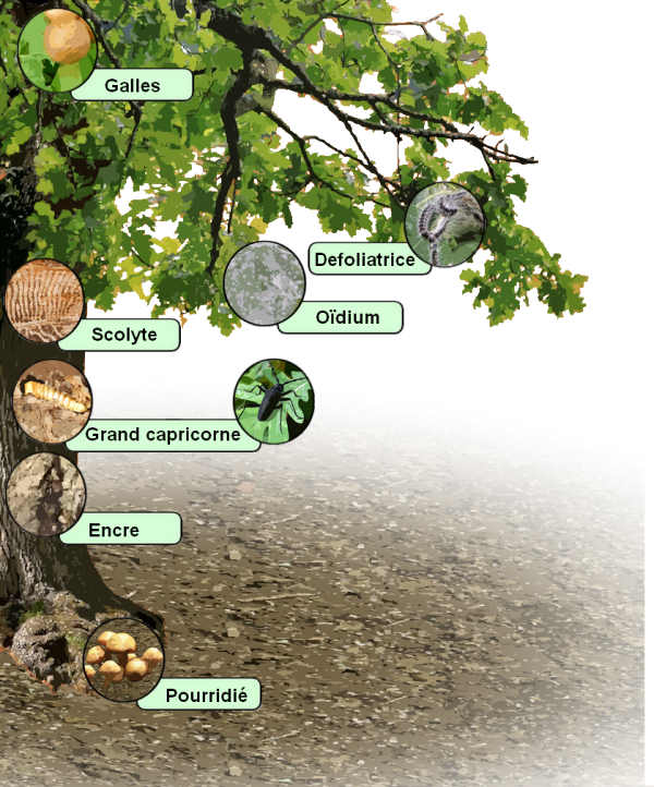 Les jeunes chênes ont le plus à souffrir des maladies cryptogamiques et parasites. Des insectes xylophages attaquent les sujets affaiblis.