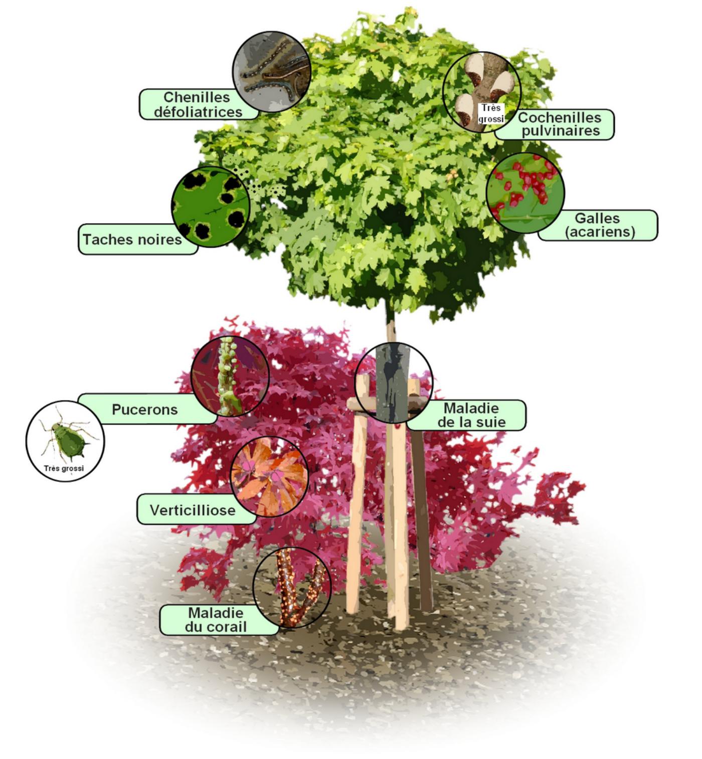 les nombreuses espèces d’érables, japonais, sycomore, champêtre, etc. peuvent se voir infecter, infester par des maladies et parasites. Quelques traitements biologiques et bonnes pratiques en limiteront l’impact.