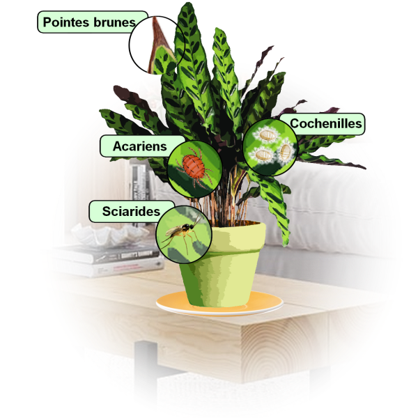 | Araignées rouges : | Les tétranyques, connus sous le nom d'araignées rouges, peuvent être un problème. Ils se nourrissent de la sève de la plante, ce qui peut entraîner un affaiblissement général et des feuilles recroquevillées. | Vaporisez donc de l’eau non calcaire régulièrement sur le feuillage pour humidfier pour offrir une ambiance humide autour du Calathea. |