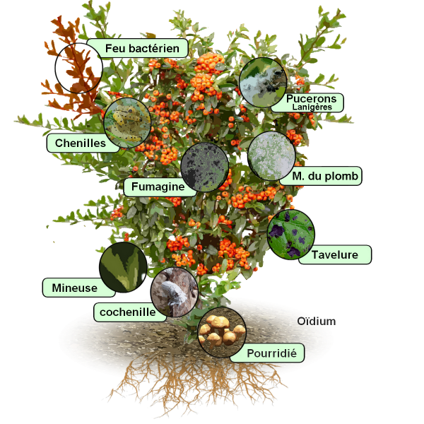 Plusieurs maladies, principalement d'origine fongique ou bactérienne, peuvent affecter le Pyracantha et mettre rapidement à mal une haie défensive par exemple.