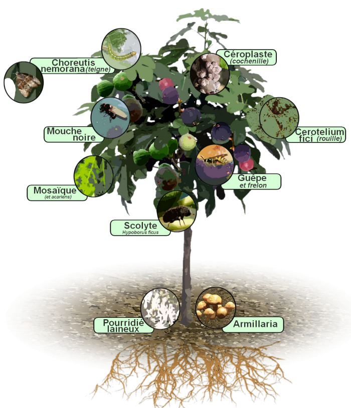 Arbre normalement résistant, le figuier peut être parfois infesté par divers insectes et souvent causé par de mauvaises pratiques, infecté par des maladies. Une bonne prévention s’impose et des traitements bio sont possibles.