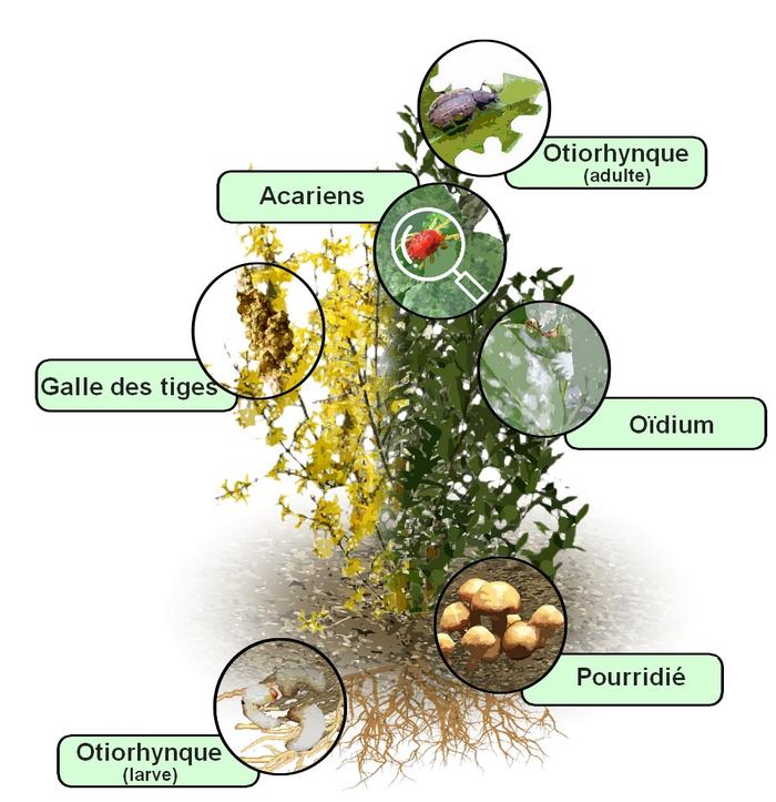 Planté dans presque tous les jardins, le forsythia selon les conditions de culture peut être sensible à certaines maladies cryptogamiques et quelques parasites. Une bonne prévention et des traitements biologiques en limitent l’impact.