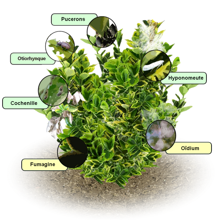 Si le fusain d’Europe est assez résistant bien qu’il puisse être infesté par l’hyponomeute, c’est surtout le fusain à feuillage panaché qui est sensible par exemple à l’oïdium et aux cochenilles.