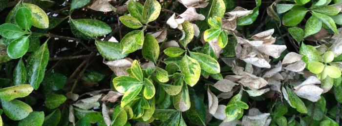 Poudrage blanc sur les feuilles du fusain qui si rien n’est fait finissent par se dessécher et tomber. |
