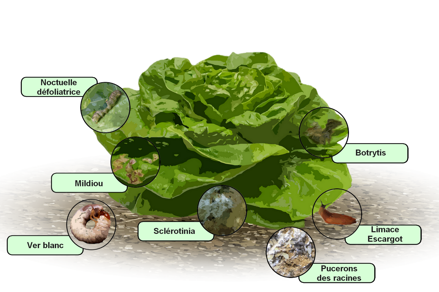 Au potager, les laitues peuvent être atteintes par de nombreuses maladies ou parasites. Des traitements bio et de bonnes façons culturales en limitent les dégats.