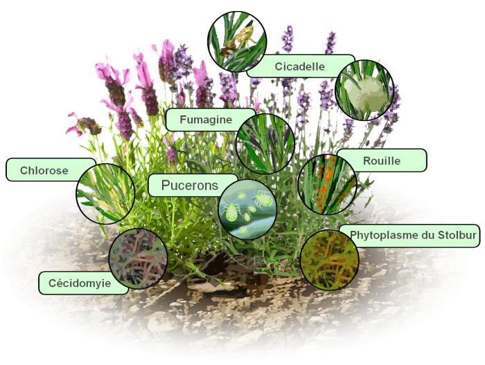 Rouille | Cette maladie cryptogamique s’attaque au feuillage des lavandes en provoquant l'apparition de taches orangées, les feuilles se dessèchent et tombent. |