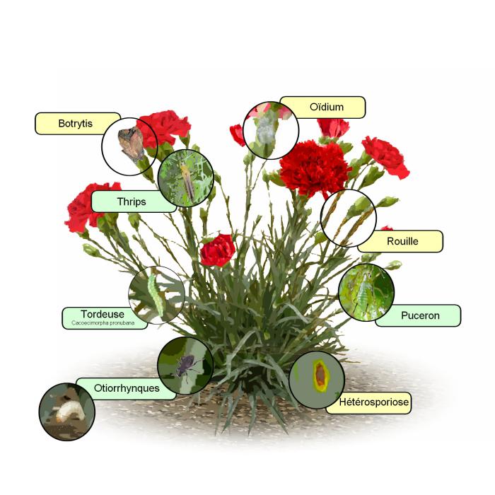 En pleine terre ou en pots, les œillets (des fleuristes, chabaud, d’inde ou mignardise) peuvent être infectés par de nombreuses maladies ou infestés par des parasites. Des traitements bio et de bonnes façons culturales en limiteront les dégâts.