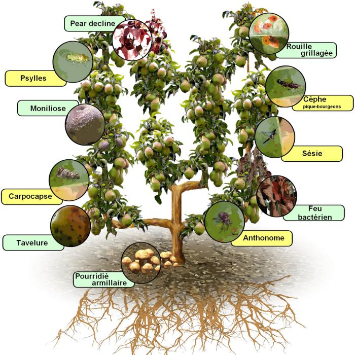 Le feu bactérien du poirier : Comme toutes les autres espèces d’arbres, l’arbre atteint doit rapidement être arraché et brulé. La variété « Passe-Crassane » est naturellement sensible au feu bactérien.
