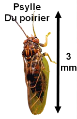 Psylles du poirier : petit insecte suceur (voir image) produisant un miellat sur lequel peut se développer la fumagine. Il est aussi vecteur de la maladie du dépérissement des poiriers. Traitement bio des psylles : pièges englués. Pulvérisez une solution de savon noir à 20 g au litre.