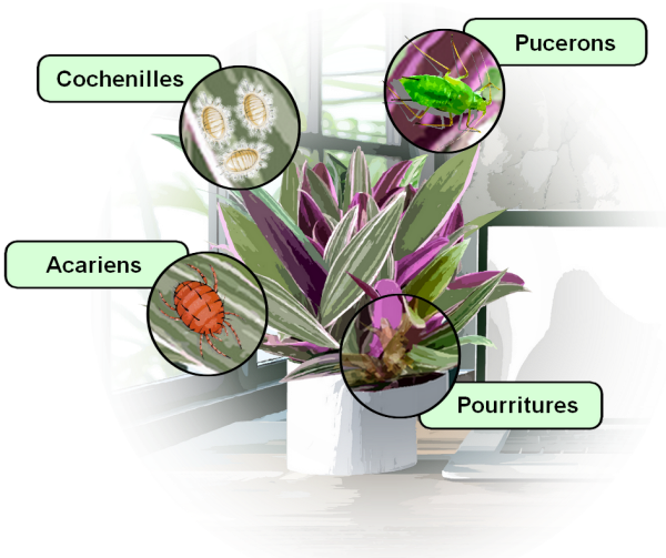 | Araignées rouges (acariens) : | Les tétranyques se nourrissent de la sève du rhoeo spathacea , ce qui peut entraîner un affaiblissement général et des feuilles déformées. | Vaporisez donc de l’eau non calcaire régulièrement sur le feuillage pour humidfier pour offrir une ambiance humide autour de votre plante pour les faire fuire. Comme pour les pucerons utilisez une décoction d'ail. |