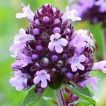 Les feuilles sont très petites, de forme ovale et recouvertes de poils. Les fleurs, de couleur pourpre ou blanche, réunies en épi, apparaissent en juin.