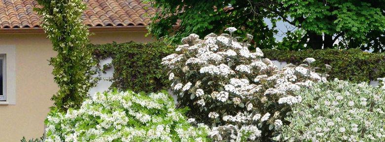 Un massif d’arbustes vert et blanc apporte une note de fraicheur à votre jardin. En voici un exemple.