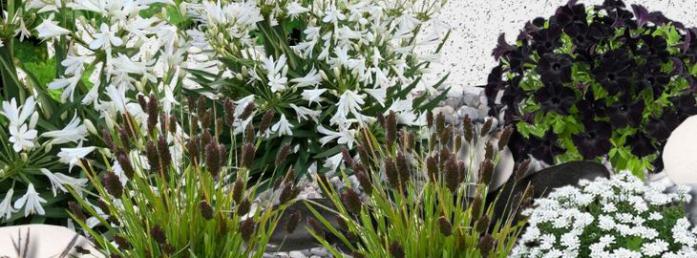sur le modèle choisi vous trouvez : des agapanthes blanches, des roses trémières nigra, des ibéris amara, des Ophiopogons planiscapus Nigrescens (souvent pris à tort pour des graminées), des Seslerias heufleriana, des alteas officnalis, des Petunias Sweetunia « Blaxk satin ».