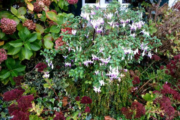 Composé d’hortensias, de gauras, de sedum spectabilis, de fuchsias, de physocarpus, de lierres, de Lysimachia nummularia après avoir subi les effets des périodes de canicules estivales et perdu ses couleurs, le voilà grâce aux pluies d’automne salutaires et des douces températures diurnes et nocturnes qui reprend des couleurs s’accommodant parfaitement au violet des fleurs du fuchsia.