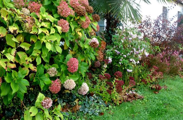 Avec l’arrivée de l’automne, le jardin prend des couleurs inhabituelles. Ce massif pimpant et très coloré au printemps et en été se pare de tons tirant sur le mauve.