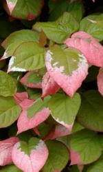 Le principal attrait de cette grimpante caduque sont ses masses de jeunes feuilles teintées de violet, qui foncent ensuite et se couvrent de taches roses et blanches. Les petites fleurs blanches répandent un parfum léger en début d'été.