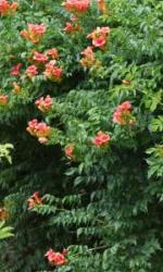 La bignone est une grimpante caduque à croissance rapide, qui s'attache par ses racines aériennes. En juillet-septembre, 'Madame Galen' porte des bouquets de fleurs tubulaires orangées, fort bien mises en valeur par le vert profond des feuilles découpées. Elle met plusieurs saisons à couvrir une pergola de 5 m.
