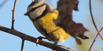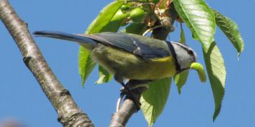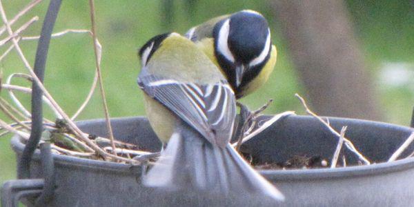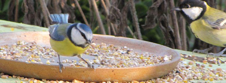 La mésange bleue reste sur les hautes branches, la mésange charbonnière se nourrit sur les branches basses et au sol.