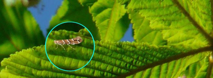C’est sa larve une petite chenille qui se nourrit du limbe. La taille de la chenille varie selon son stade d’évolution. Elle va de 0,5 mm quand elle transperce les feuilles pour y creuser des galeries pour se nourrir du limbe à 5 mm avant de former un cocon dans la galerie.
