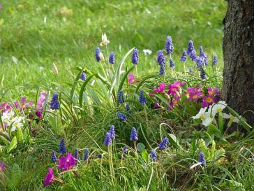 La jolie couleur bleue, pour l’espèce la plus cultivée (muscari armeniacum), servira d’écrin aux autres fleurs de printemps.