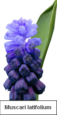 Ce qui caractérise ces muscaris c’est leurs larges feuilles. Les fleurs sont violet foncé à la base et bleu clair au sommet.