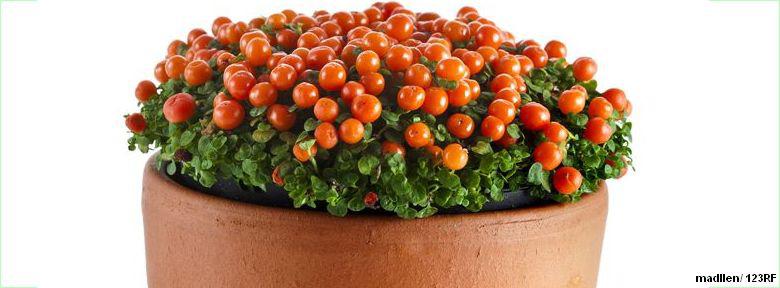 Nertera balfouriana possède de toutes petites feuilles opposées et peut s'étendre sur 25 cm. Il produit des baies orange en forme de poire.