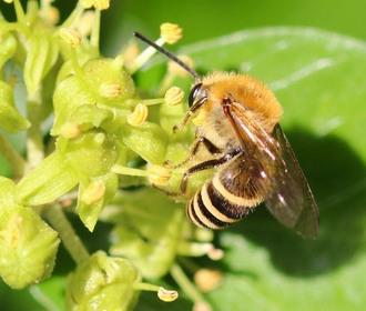 Voilà une des abeilles sauvages les plus tardives du jardin. Chaque année, la Collète du lierre (Colletes hederae) attend sinon l’automne du moins la floraison du lierre pour émerger. D’abord les mâles, toujours en mouvements, prêts à en découdre et à se disputer, bientôt, les faveurs de ces dames !