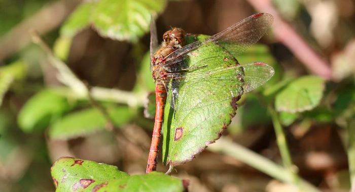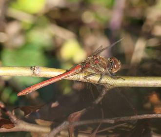 Passés déluge et coups de vent, à la moindre éclaircie, Monsieur Sympétrum strié (Sympetrum striolatum) part en chasse. Avec un piquet, une branche basse ou une feuille de ronce pour affut. Il y revient tour à tour, rarement bredouille, après chacun de ses raids éclair.