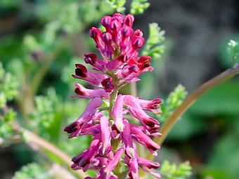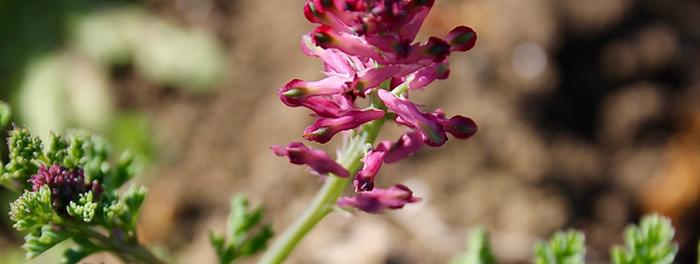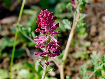 Parmi les dernières à tenter sa chance, la Fumeterre officinale met les bouchées doubles. Plutôt terne, avec des allures de persil frisé, le feuillage ne retient guère l’attention. La tentation est grande d’en arracher les rosettes. Il serait toutefois dommage de ne pas attendre un peu. Les tiges grimpent vite en cette saison et, en toute hâte, la belle ne tarde pas à lancer ses superbes épis ! Entre rose et pourpre, les petites fleurs tubulaires signalent l’entrée de leur calice par un rouge plus soutenu. Les pollinisateurs ne s’y trompent pas.