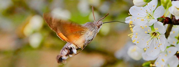 Dans le grand bal du mirabellier tout juste en fleurs, le Moro sphinx est assez facile à repérer, parmi abeilles, syrphes et bourdons. Son vol stationnaire ne ressemble à aucun autre, flamboyant sous le soleil. Las ! L’opération ne dure que quelques secondes. Le temps de déployer la longue trompe coudée, avec une étonnante précision, jusqu’au fond de la corolle. Et le voilà déjà parti.
