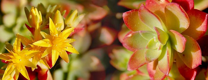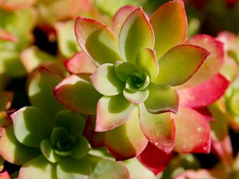 Elle n’a été privée ni de l’un ni de l’autre ces derniers mois. Certes, un peu mal en point fin septembre au sortir de la canicule, elle a magnifiquement profité de ce drôle d’hiver. D’abord avec la multiplication de rosettes bien charnues, vert tendre, pointées de rose et de rouge. Un superbe effet à elles seules.