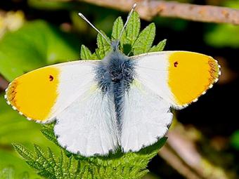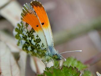 Comme un lever de soleil à la pointe des ailes. La petite Aurore mérite bien son nom. Le mâle du moins puisque l’avers des ailes de la femelle, plus sobre, est presqu’immaculé. Seuls s’y détachent, sur fond blanc, ocelles et marges sombres aux antérieures, ainsi qu’une légère marbrure grise aux postérieures.