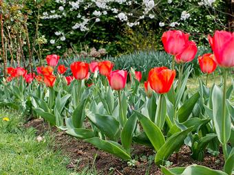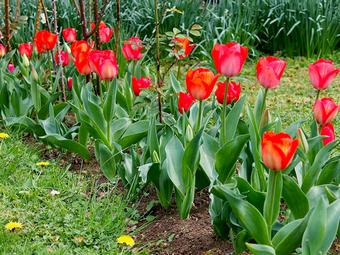 Le tempo est plutôt bien cadencé. Jonquilles, primevères et forsythia à peine flétris, les tulipes arrivent à point nommé pour faire oublier l’overdose jaune de la fin d’hiver. Plantées l’automne dernier, elles commencent à illuminer la plate-bande des rosiers dont les premiers boutons sont en formation. Leur dominante rouge, nuancée ici et là de rose et d’orangé, est la bienvenue pour donner du tonus au jardin en attendant le réveil des vivaces.