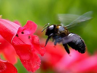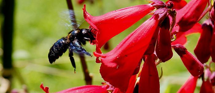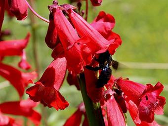 Oh, évidemment, les autres butineurs n’y sont pas indifférents. Les bourdons surtout visitent ainsi régulièrement les superbes trompettes rouge vif du Penstémon. Mais la plus assidue, dans son vol noir bleuté, est certainement l’Abeille charpentière.