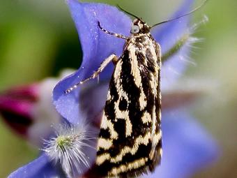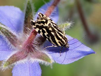 Sa tenue de camouflage a belle allure. Et ses grands yeux bleus pointés de noir attirent irrésistiblement le regard. L’Arlequinette jaune - Acontia (emmilia) trabeatis - s’est réfugiée parmi les fleurs de bourrache pour attendre la nuit. Bourdons et abeilles ne la dérangent pas. Le photographe davantage. Elle passe ainsi de fleurs en feuilles pour chercher un couvert. Et finit par s’envoler en quête d’un gîte plus tranquille.