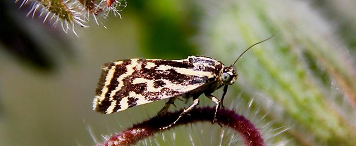 Comme beaucoup de petits papillons de nuit, il s’accroche à l’arrière d’une feuille ou sur la tige d’une graminée pour se faire oublier le jour. Toujours les « bras » en croix. Ou plus exactement en « T », tant sa tête est peu proéminente. L’abdomen pendant et les interminables pattes arrière ballantes. Des pattes frêles pourvues de longues « épines » qui contribuent à l’étrangeté de la silhouette.