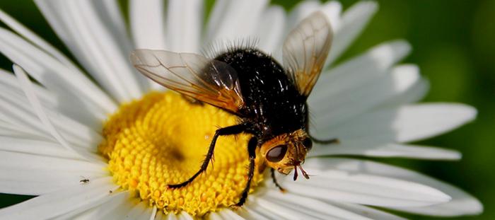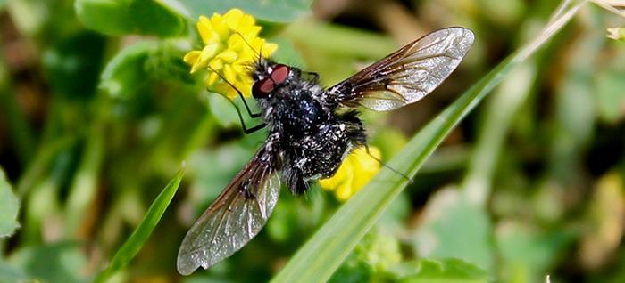 Une allure de bourdon. Surtout en vol. Mais le corps est entièrement noir. Luisant. Hérissé de soies épaisses. C’est une mouche. La plus trapue qui soit. L’Échinomye grosse (Tachina grossa), la bien nommée. Tranchant sur la dominante sombre, la face est jaune orangé. Comme les nervures des ailes et l’extrémité des pattes.