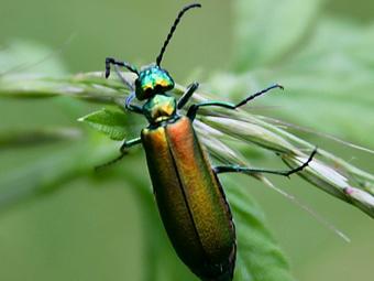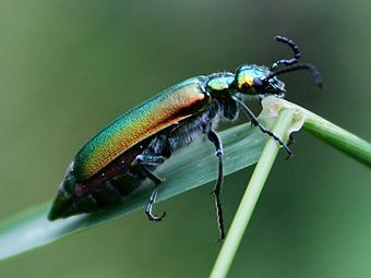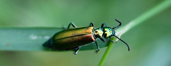 Comment ne pas tomber sous le charme ? La Cantharide officinale (Lytta vesicatoria) est d’abord un superbe coléoptère. Entièrement vert métallique, avec des nuances bleutées ici et là, mais surtout cuivre et bronze sur les élytres.