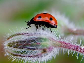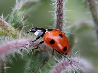 Trois points de part et d’autre. Un septième au centre, à cheval sur les deux élytres, à l’arrière du corselet. Voilà donc la Coccinelle à sept points (Coccinella septempunctata). Rouge orangé. Bien ronde. Surtout lorsqu’elle est au repos, la tête entièrement rétractée. Mais ici, sur un pied de bourrache, pas question de repos !