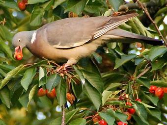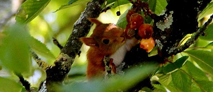 Hélas, pluie, fraîcheur, manque de soleil, et sans doute fatigue du vieux cerisier : les fruits pourrissent dans l’arbre avant complète maturité. Qu’importe pour les chapardeurs ! Mésanges, merles, pigeons et même l’écureuil se partagent l’aubaine. Les grives également, mais plutôt au pied de l’arbre. Elles n’ont guère à attendre pour se régaler des fruits tombés à terre !