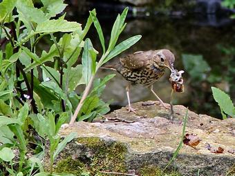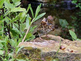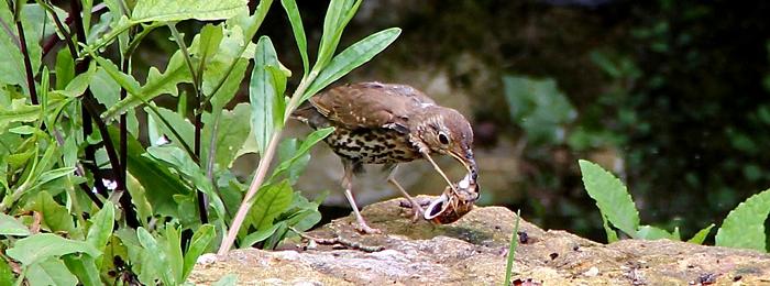 L’an passé, elles avaient surtout utilisé un gros caillou, à l’abri des regards, derrière les grandes touffes d’artichaut. Les grives musiciennes sont moins cachotières cette année. Il est vrai qu’à l’occasion du réaménagement de la petite mare, la bordure de pierres plates a (provisoirement) perdu son couvert de lierre. Voilà donc autant d’enclumes certes moins discrètes, mais tellement pratiques pour décortiquer les escargots !