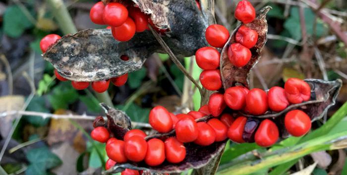 Son nom latin est peu engageant : l’Iris foetidissima. Fétide ! D’aucuns préfèrent évoquer les étranges relents de grillade de son feuillage froissé. Voilà donc l’Iris gigot, sans doute un des iris les plus discrets. Du moins en cette saison.