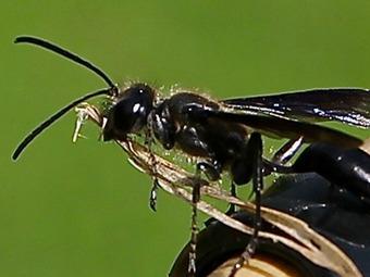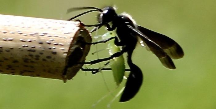 Un long brin de raphia à pleines mandibules… À quel étrange manège cette guêpe noire se livre-t-elle au potager ? L’Isodonte mexicaine (Isodontia mexicana) s’intéresse tout particulièrement aux tiges de bambou stabilisant les piquets de tomate.