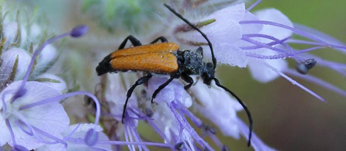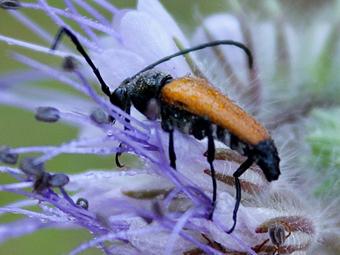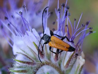 Quand on aime pollen et nectar, la planche de phacélie est un passage obligé au jardin. Le Lepture fauve (Strictoleptura fulva) y a passé la nuit. Au petit matin, il est toujours là. Perlé de rosée, il ne tarde pas à entamer son petit-déjeuner. Pourtant, comme perturbé par le retour du va-et-vient des abeilles et des bourdons, il préfère bientôt s’envoler vers des inflorescences ensoleillées plus tranquilles. Sur le halage sans doute.
