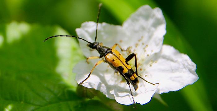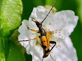 Comme son cousin, le Lepture fauve, c’est un grand amateur de pollen. Au jardin comme au bord des haies, on rencontre donc le Lepture tacheté (Rutpela maculata) sur les ombellifères aux étamines nombreuses et facilement accessibles. Ici plus modestement sur une fleur de mûrier.