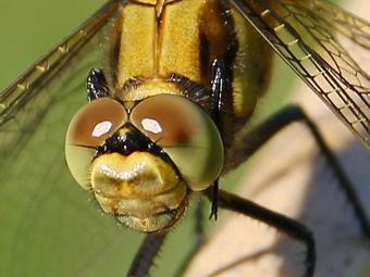 Et quels yeux ! Deux gros haricots marron et vert olive. Les reflets du soleil y accentuent l’allure inquiétante d’une face jaunâtre sans équivoque. Il ne doit pas faire bon voler à proximité !